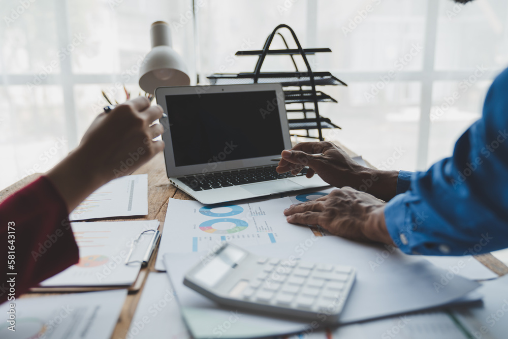 Group of business people, investors analyzing financial reports from documents to calculate income, taxes from graphs. Growth charts to save data on laptop, tablet preparing for meeting results.