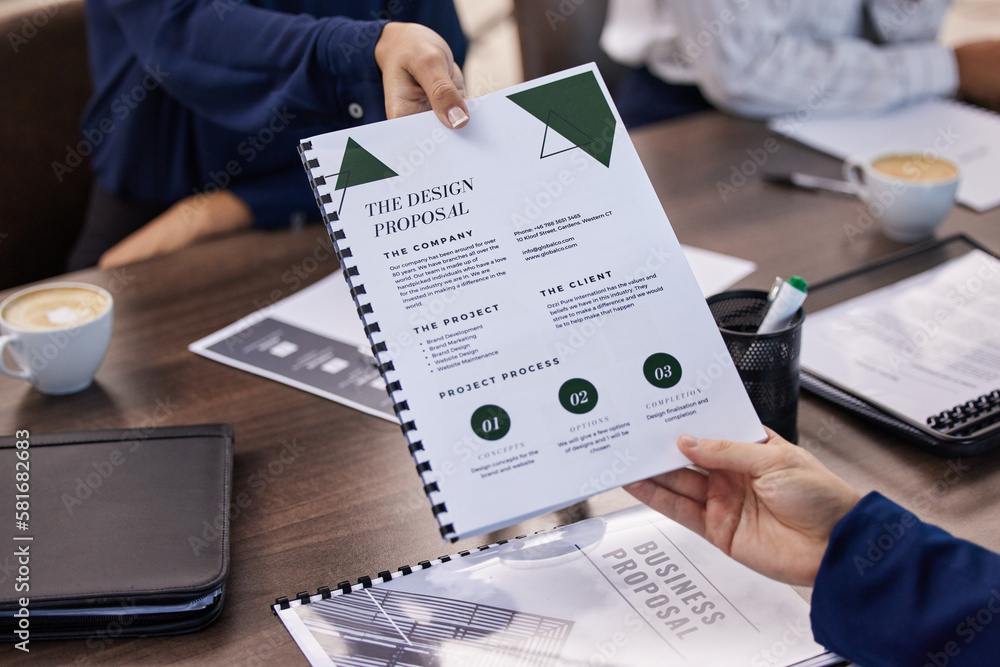 Hands, documents and design proposal by business people in meeting for creative collaboration. Hand, paper and form by woman designer with idea for marketing partnership on innovation or mission