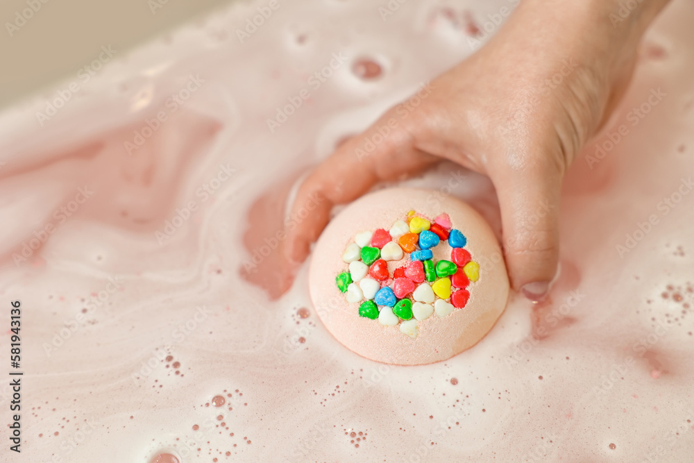 Woman putting bath bomb into water, closeup