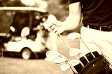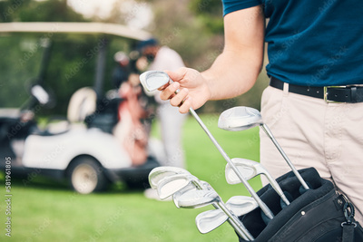 Golf, choose club and hands of man with bag on course ready to start game, practice and training for competition. Professional golfer, golfing and male caddy for exercise, fitness and recreation