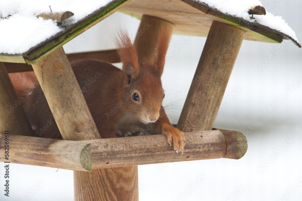Ein rotes Eichhörnchen sitzt im Winter in einem Futterhaus mit Schnee, sciurus vulgaris