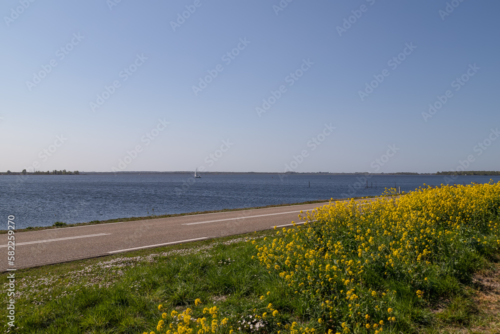 Countryside road along the Eemmeer with blooming yellow rapeseed in the foreground.
