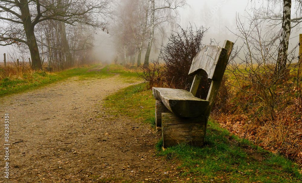 Rustikale Holzbank am nebligen Waldweg im Herbst. Dicke Nebel hängen über dem Moorland und den kahlen Bäumen. Dunkle, feuchte Erde und grünes Gras im Vordergrund. Einsame, stimmungsvolle Szene.