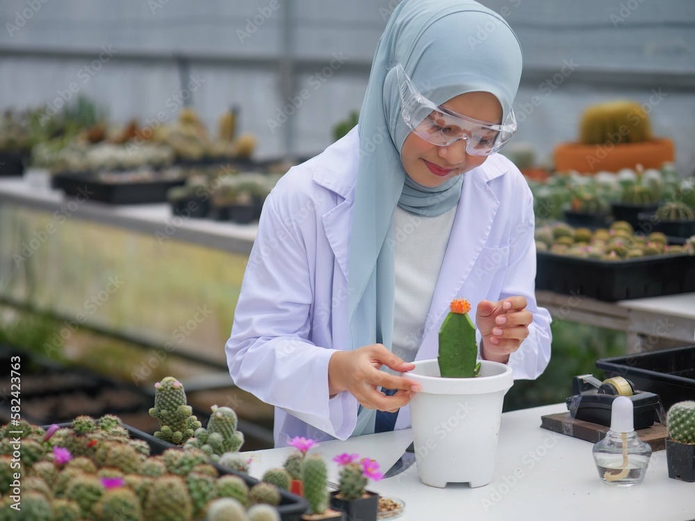 The beautiful muslim botanist prepare for propagation of the cactus in the green house closed room