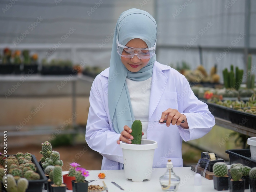 The beautiful muslim botanist prepare for propagation of the cactus in the green house closed room