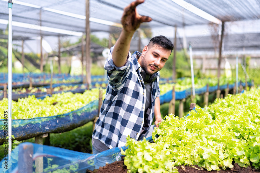 Smart farmer wearing head phone enjoy listen music and morning walk checking growth vegetable plant