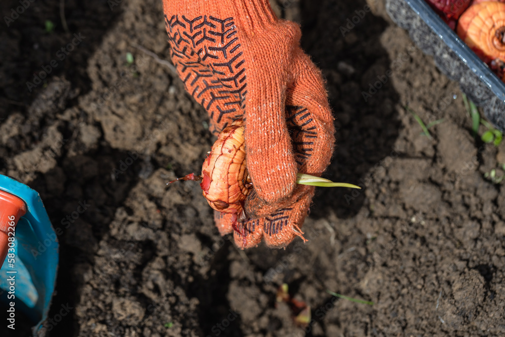 the hand plants bulbs of flowers in the soil