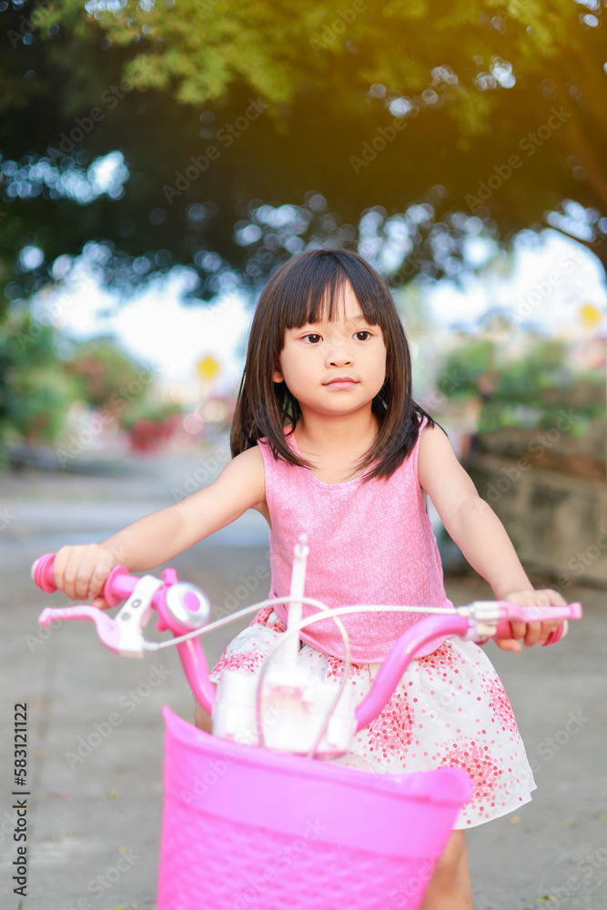 Portrait image of 5-6 years old kid. Happy Asian child girl ride a bike at the park outdoor. Exercise for health and sport. Summer season.