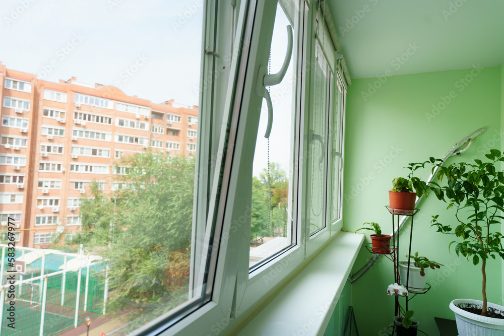 interior of the balcony with large glazed windows in the apartment.