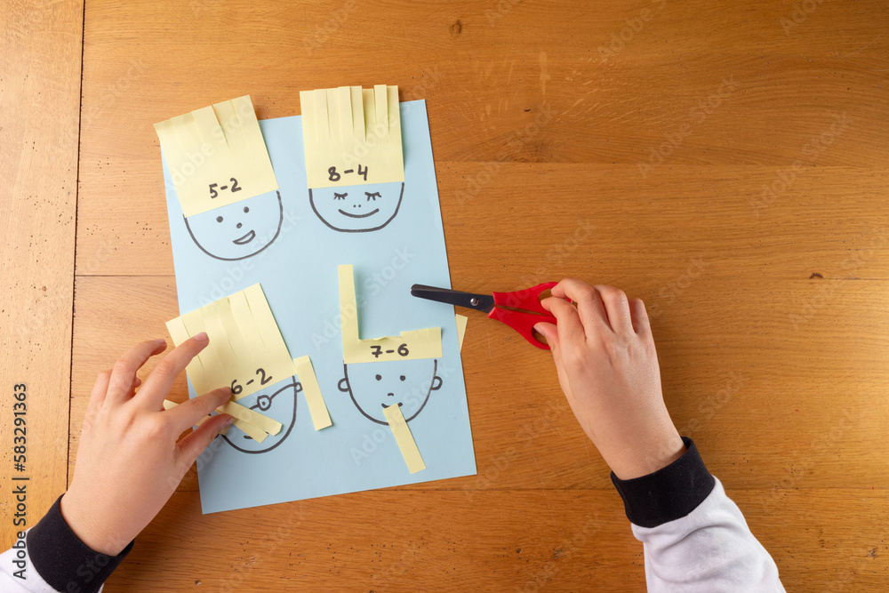preschooler mathematics activity, kids hands cut paper with numbers, scissors craft