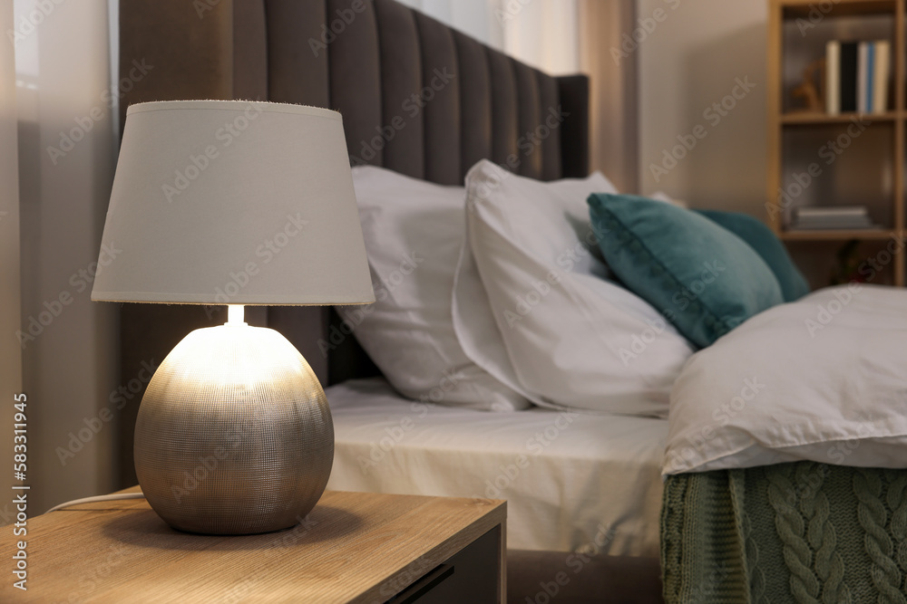 Lamp on wooden bedside table and comfortable gray bed in bedroom