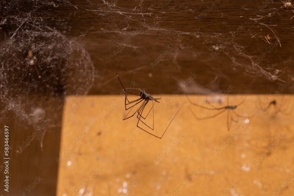 close up detailed shot of daddy long legs spiders hanging from their webs in a cabinet outdoors