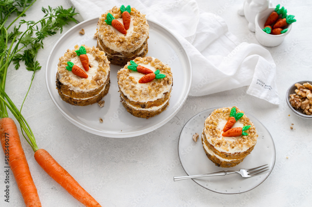 Easter Carrot cake with cream cheese frosting and marzipan decorations on a white stone background for festive dinner. Small easter bento cake. Fresh homemade carrot cake. Traditional Easter food.