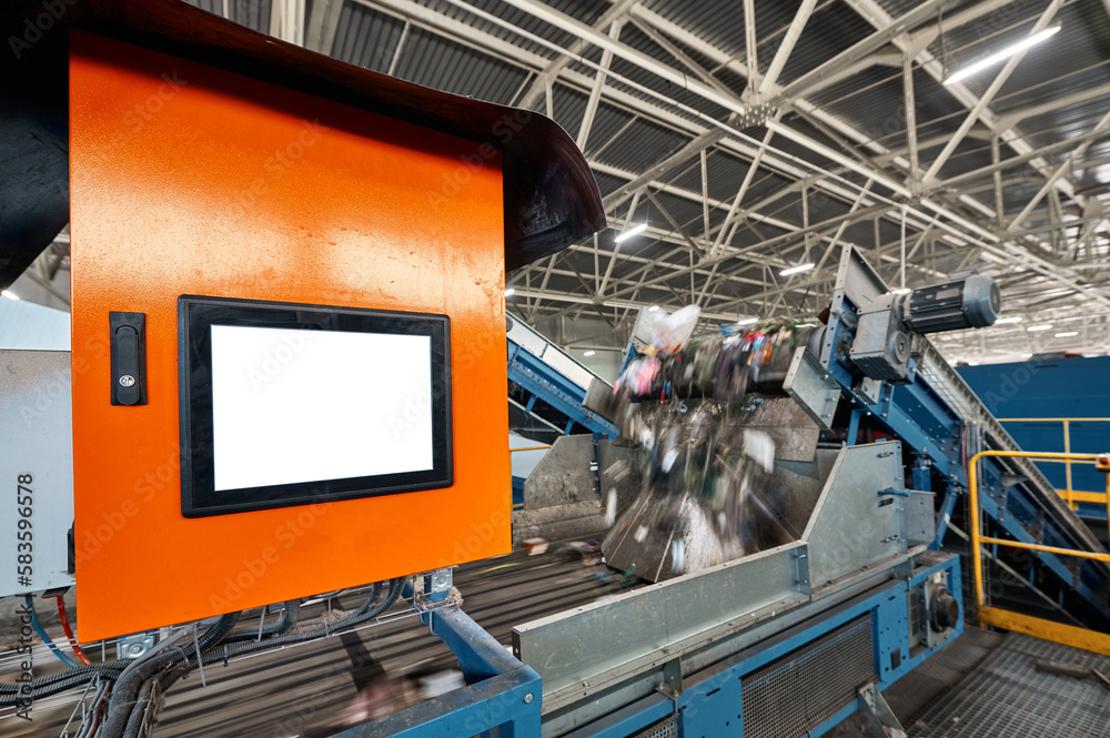 Control panel of production line in recycling plant workshop