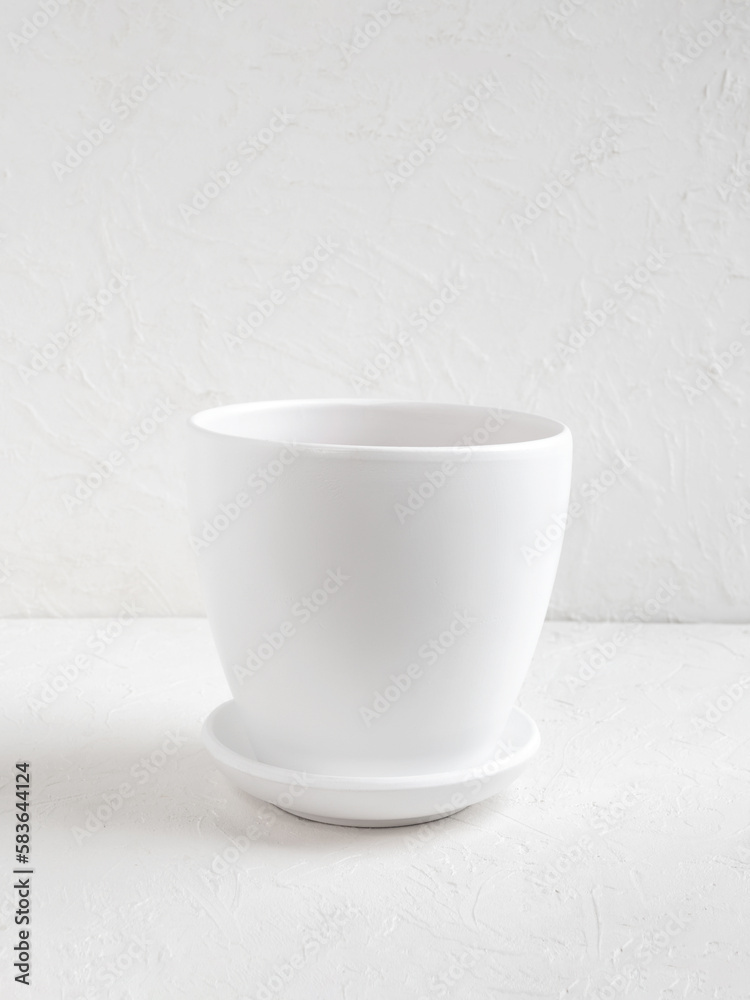 Vertical view of empty new white flower pot stands on a white table. Copy space.