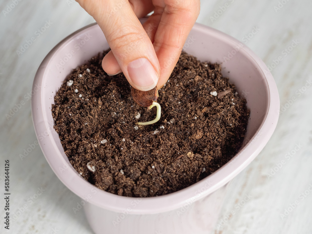 Wisteria seed with a small root is planted in the ground, close-up. Fingers hold the seed above the ground before planting.