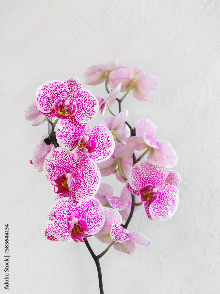 Tropical branch white with small purple speckles orchid flowers phalaenopsis (pandora elegance), known as the Moth Orchid or Phal. Flower on the white background. Selective focus on foreground.