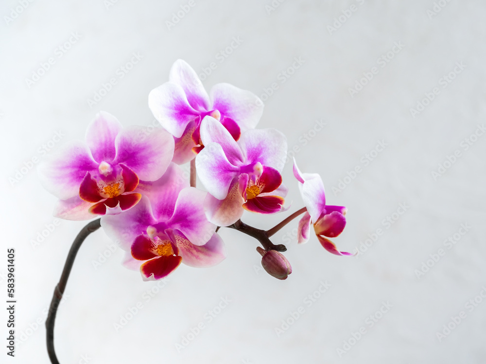Beautiful Anthura Buenos Aires orchid flowers on white background, copy space. Tropical flower, branch of orchid close up. Lilac orchid background. Holiday, Women's Day, Flower card.