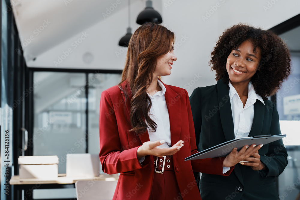 Multiethnic business, Beautiful American African with asian businesswomans people in meeting. Accountant people do document, tax, exchange, accounting and Financial advisor