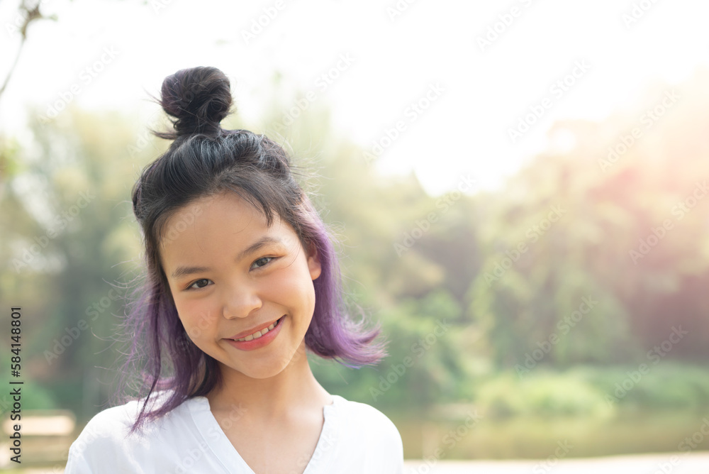 Happy teen girl 11-15 year old. Portrait of beautiful woman smiling with perfect smile and white teeth and looking away at park during sunset. Smile face asian lady girl wear casual cloth.
