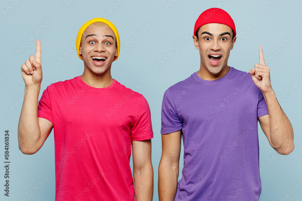 Young insighted proactive couple two friends men wearing casual clothes looking camera together holding index finger up with great new idea isolated on pastel plain light blue cyan background studio.