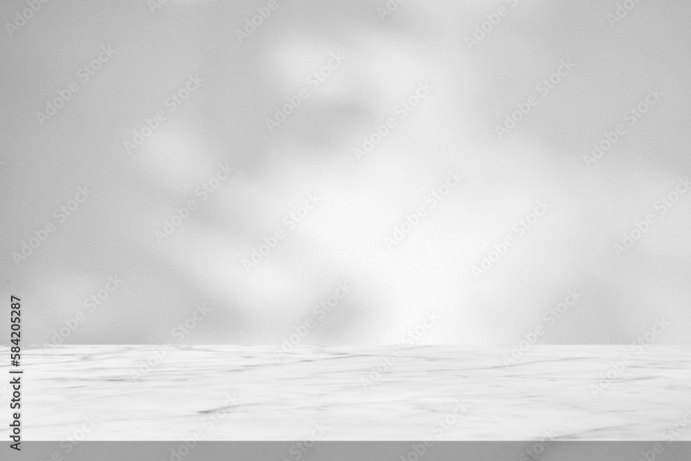 Marble table with tree shadow drop on white wall background for mockup product display