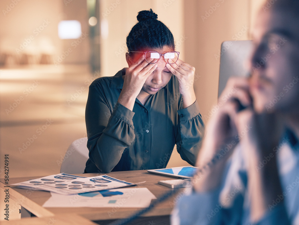 Business woman, headache and computer in stress, burnout or suffering pain at night by office desk. Female employee rubbing head or touching painful area by desktop PC feeling overworked at workplace