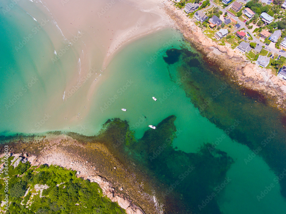 Good Harbor Beach and Salt Island aerial view in summer in Gloucester, Cape Ann, Massachusetts MA, USA.