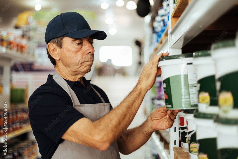Elderly man working in a hardware store restocking items on shelves. Small business concept.