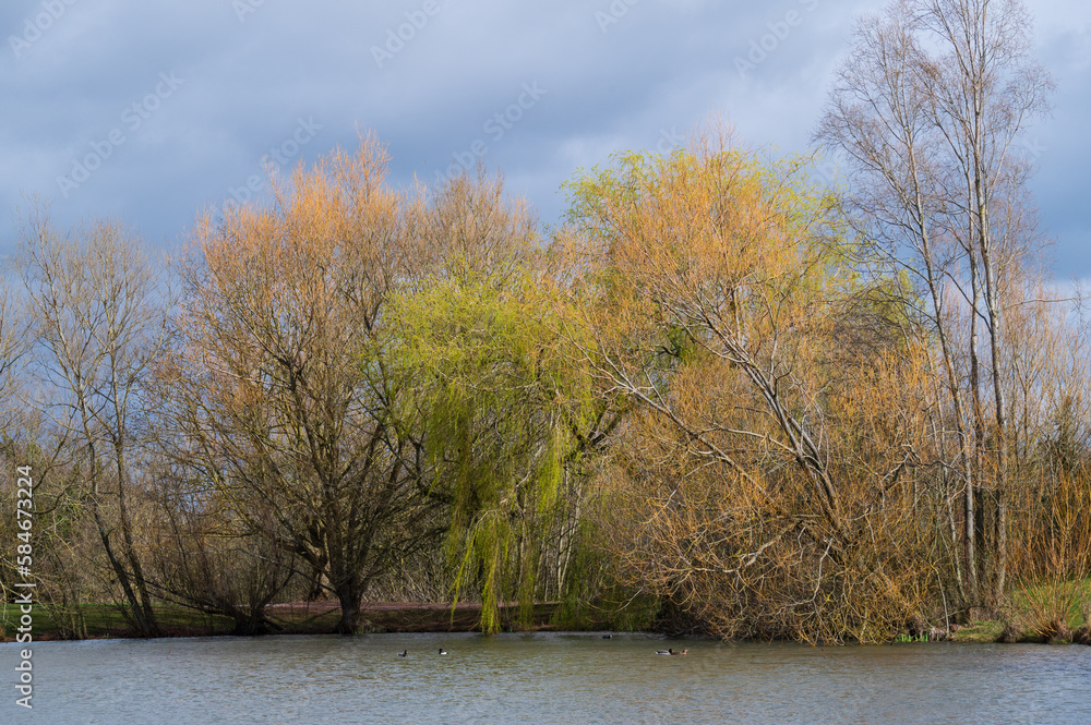 Early Spring on the lake in sunshine and cloud. with new growth.