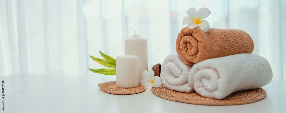 Spa accessory composition set in day spa hotel , beauty wellness center . Spa product are placed in luxury spa resort room , ready for massage therapy from professional service .