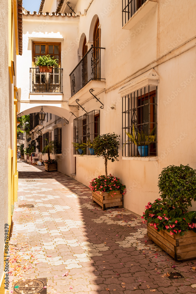 Narrow street with planters in the center of the old town of Marbella in Spain.