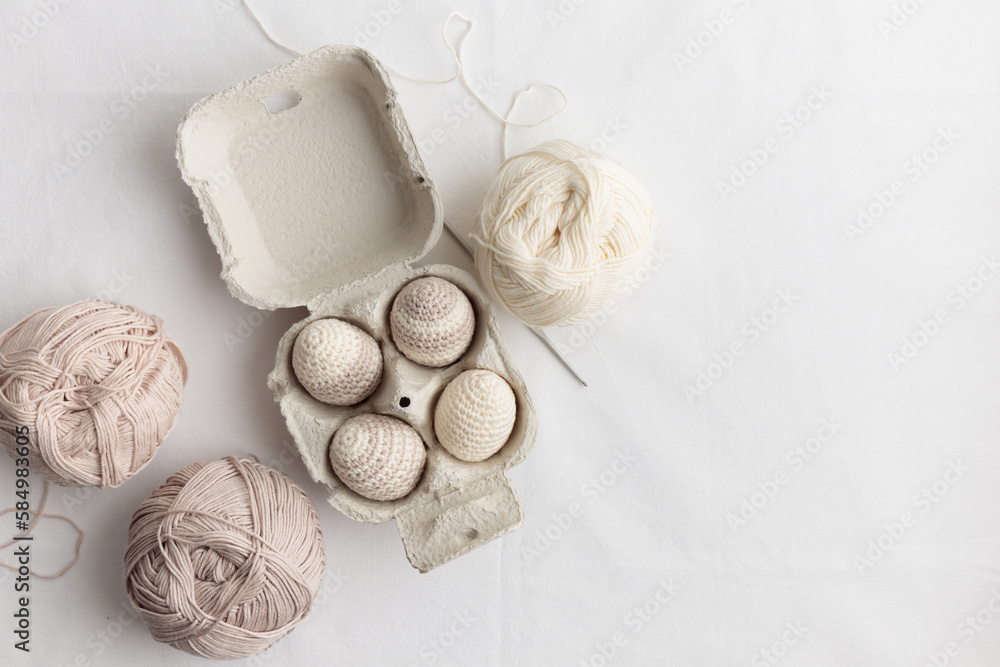 Set of cute easter crocheted eggs, pastel color in the eggbox