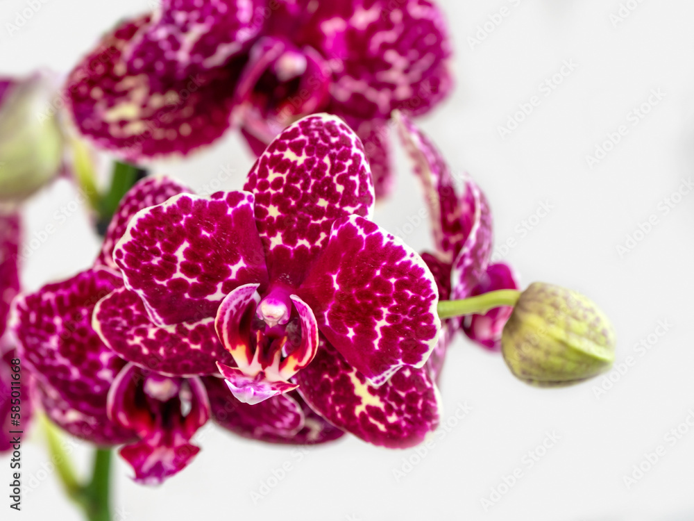 Maroon spotted orchid phalaenopsis wildcat, a branch of a blooming orchid on a white background. Tropical flower, branch of orchid close up. Purple orchid background. Holiday, Women's Day, Flower card