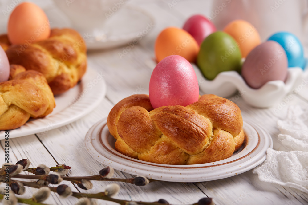 Traditional Easter bun bread in a shape of wreath made from yeast dough decorated with colored egg. Traditional Easter symbols and food. Easter baking