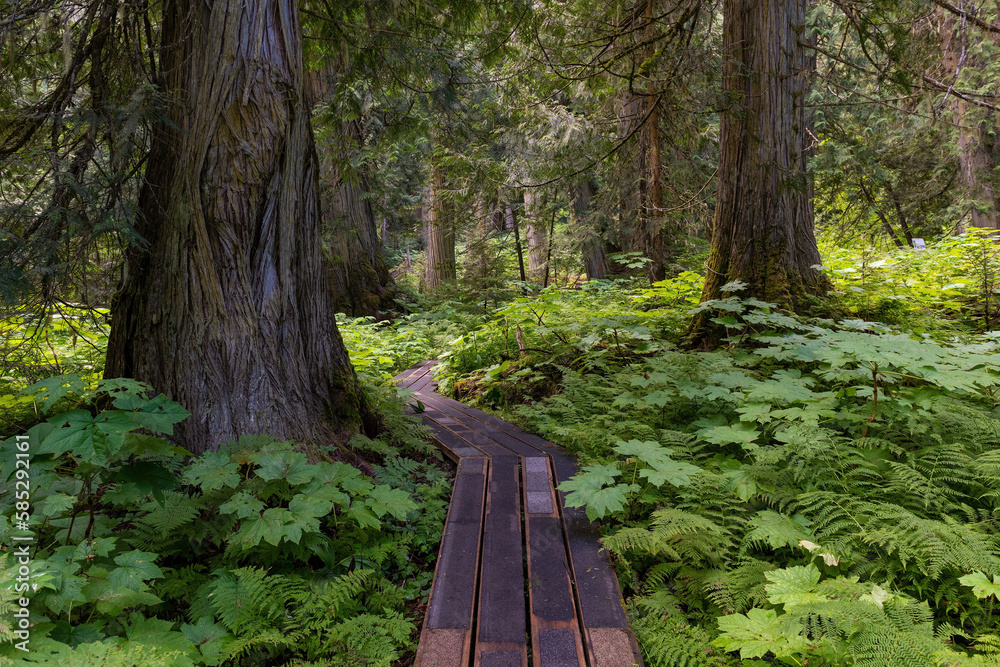 Western red cedars (Thuja plicatain) and walking path in Chun T’oh Whudujut Ancient Forest provincial park of the Lheidli T’enneh first nation natives near Prince George, British Columbia, Canada.