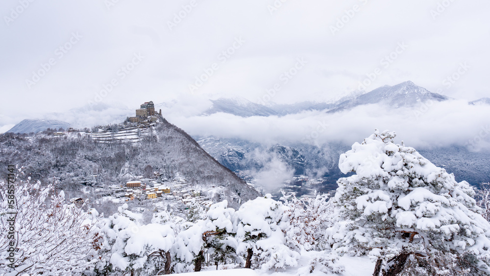 Image of the Ancient/ Abbey of San Michele built on Mount Pirchiriano located at the entrance of the Susa Valley, around the years between 983 and 987 A.D. with an abundant snowfall