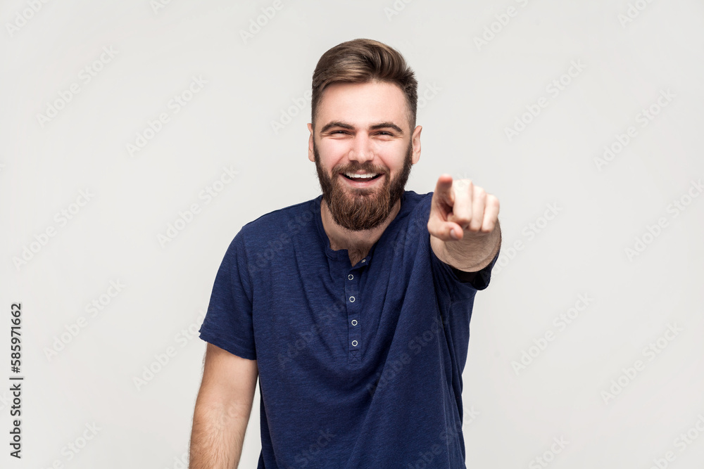 Amused handsome man laughing out loud, pointing finger to camera, indicating ridiculous idiot.