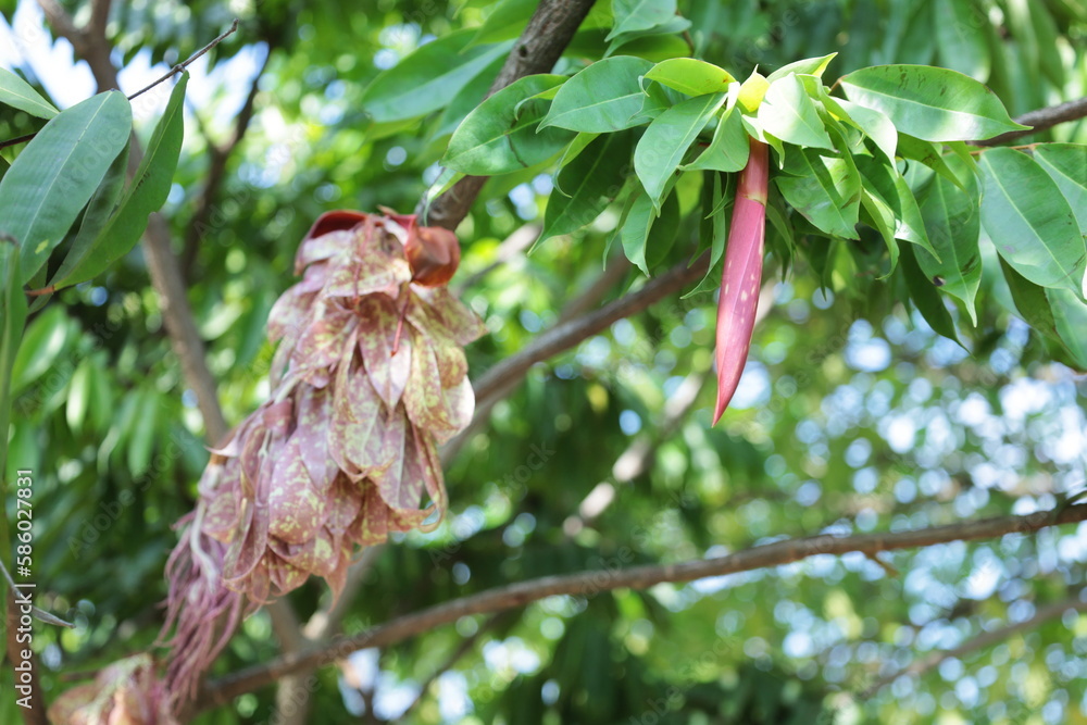 Red flower Brownea ariza Benth. (Ariza, Palo de Cruz, Rose of Venezuela). Small bright red bouquet hanging from plant on green leafy background with copy space. selective focus