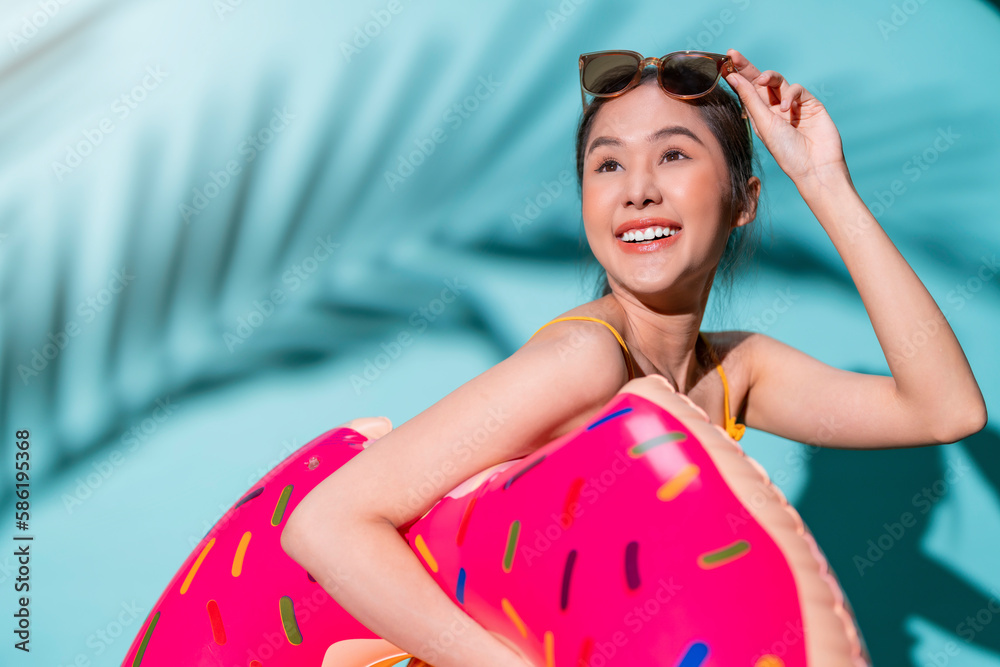 hello summer greeting young asia female woman in swimwear playful joy fun playing face expression hand gesture hold donut shape inflatable, woman ready to have fun in summer time relax casual vacation