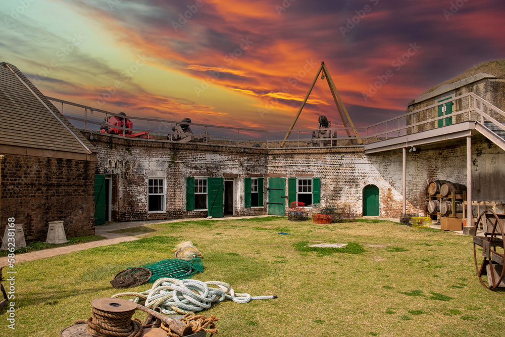 The courtyard of a military fort with brown wooden pergolas, brown wooden tables and benches and tools and equipment on the grass at Old Fort Jackson in Savannah Georgia USA