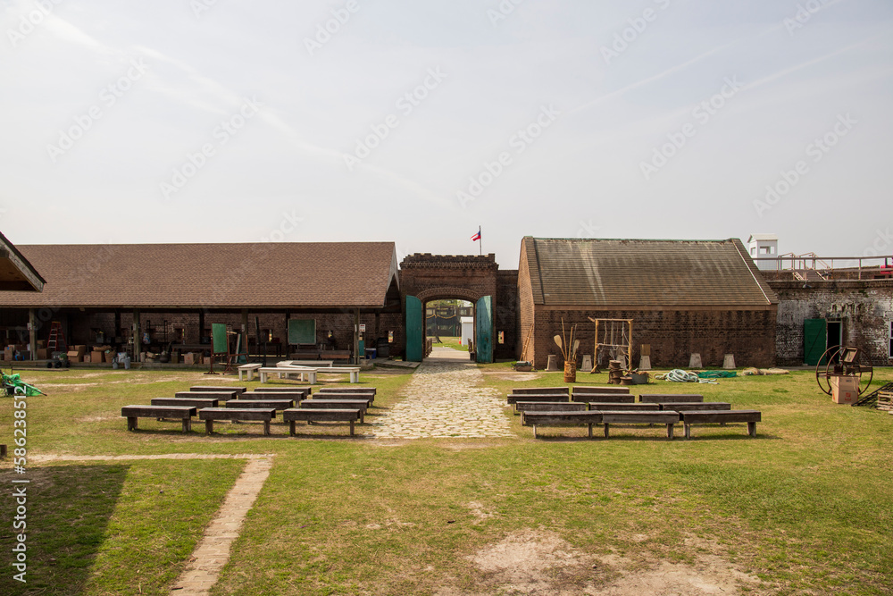 The courtyard of a military fort with brown wooden pergolas, brown wooden tables and benches and tools and equipment on the grass at Old Fort Jackson in Savannah Georgia USA