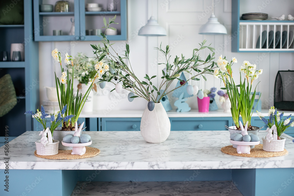 Home interior with easter decor. Kitchen utensils on table. Blue kitchen interior with furniture. Stylish cuisine with flowers in vase. Daffodils in pot and branches tree in vase with easter eggs.