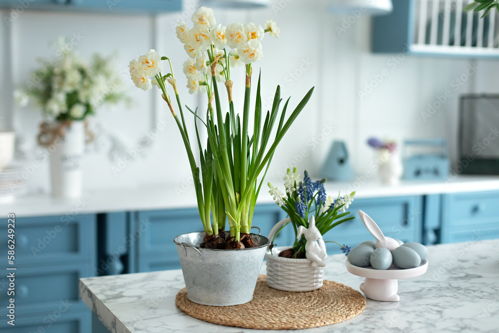 Daffodils in pot and spring flowers in vase. Home interior with easter decor. Bouquet of flowers in vase and ceramic plates, plants in pots, utensil on table in kitchen. Template
