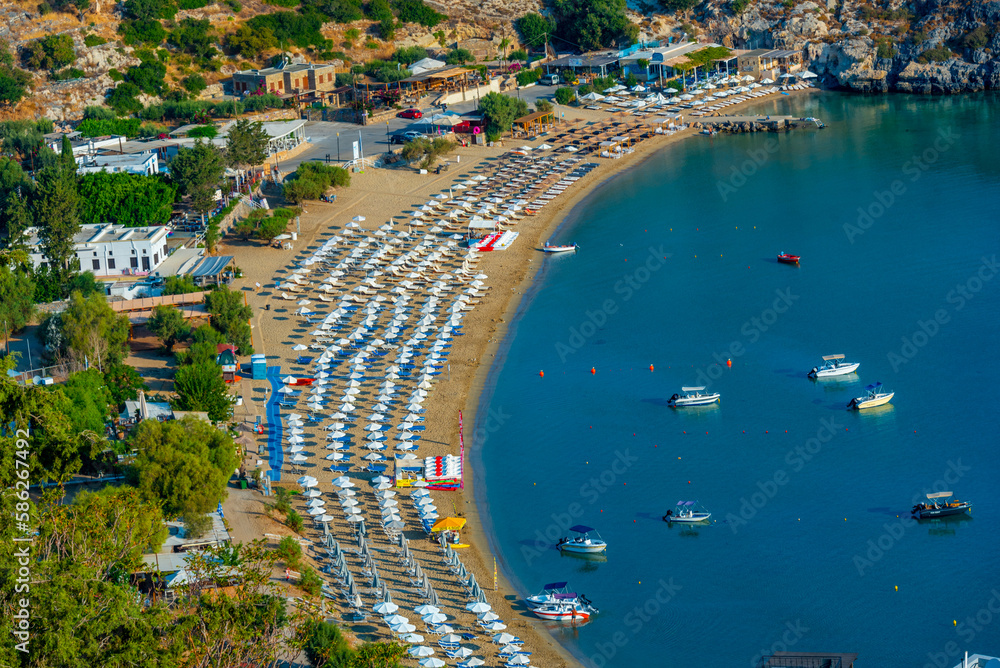 Panorama view of Lindos beach at Greek island Rhodes