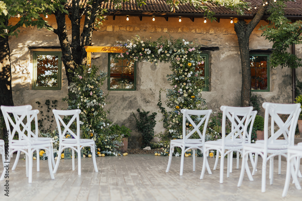 Wedding ceremony at old building. Wedding reception and decor, arch with flowers, lemon and greenery and white chairs near wall of old building in sunny summer day.