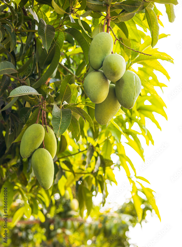 Low angle view of a bunch of unripe green mango fruits hanging from branches and their leaves.
