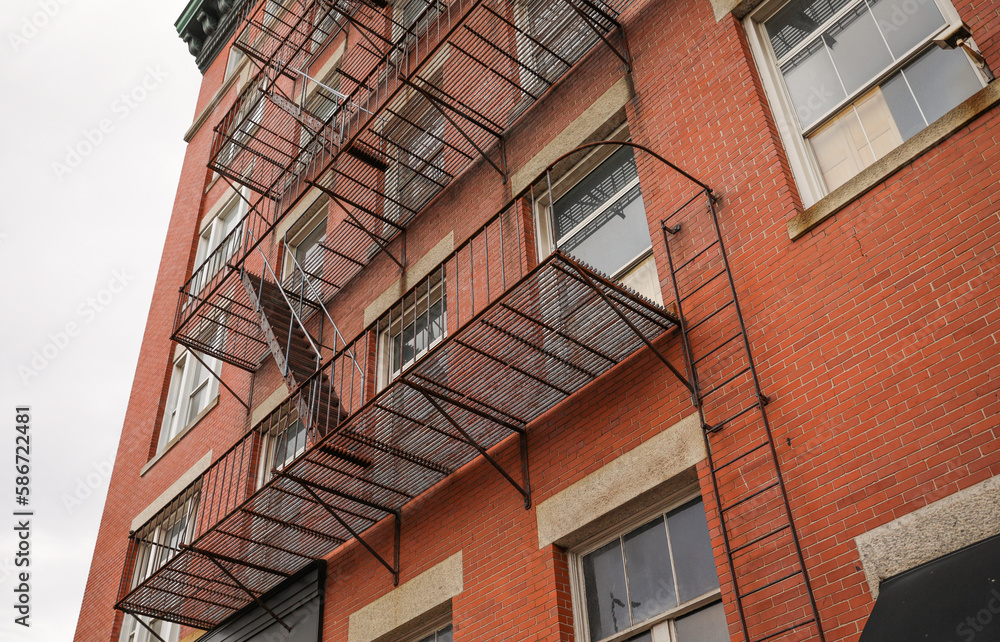 view of fire escapes on buildings and houses. A series of metal ladders and platforms are visible on the exterior walls of the structures. Captures the urban aesthetic of the fire escape.