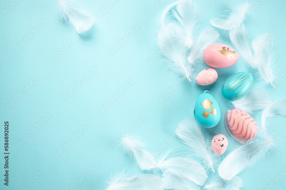 easter decorations feathers sequins pink and white easter eggs on pastel blue background. Easter background