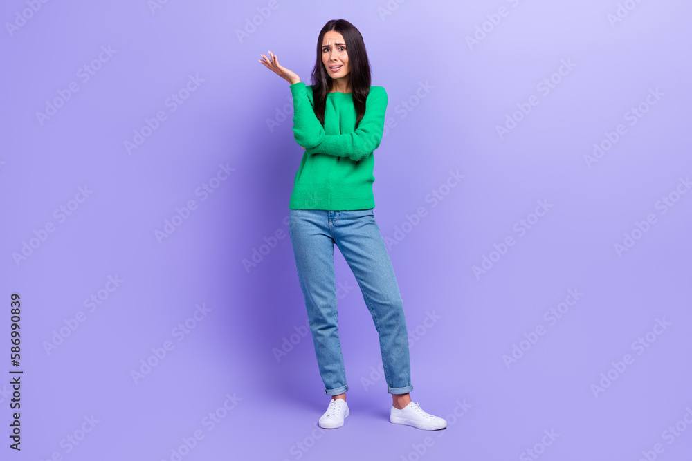 Full length photo of questioned lady ask wtf show disobedience unfair situation isolated purple color background